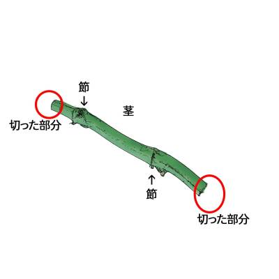 - いきなり節を細かくカットするのではなく二節くらい残してカットした方が成功率は高いです。もし断面が腐ったとしてもまだ残りの節があるので挽回できます。